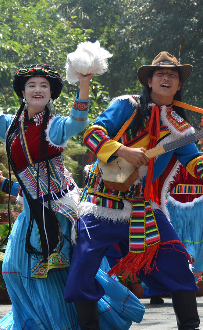 彝族在云南境內(nèi)約471萬人,是省內(nèi)人口最多、分布最廣的少數(shù)民族,主要聚居在金沙江、元江流域和哀牢山、無量山腹地。彝族是一個能歌善舞的民族,民間打歌、跳樂之風盛行,大三弦、跌腳舞久負盛名。火把節(jié)是彝族最具特色的民族節(jié)日。彝族村占地50余畝,三虎浮雕墻與虎頭內(nèi)祖師形象表現(xiàn)了彝族虎鷹文化。太陽歷廣場圖騰柱上有太陽、虎、火和八卦圖形象,周圍環(huán)繞著10個朝向不同的月球造型,外圓周有12生肖石雕。依山而建的“...
